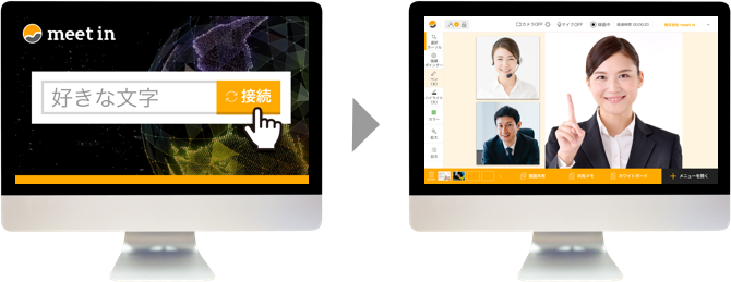 meet inのTOPページ上で作成したURLを共有するだけでスタート可能。世界中どこにいてもパソコンやタブレットが1台あればいつでもmeet in。